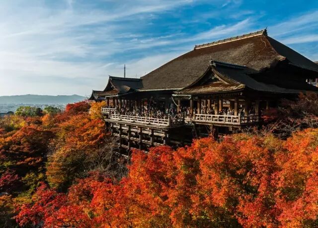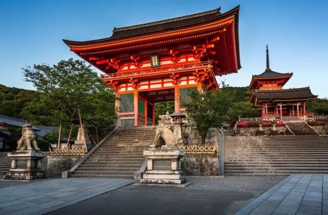 清水寺位于京都东部音羽山的山腰,始建于 778 年,是京都最古老的寺院,曾数次被烧毁并重建,后于 1994 年被列入世界文化遗产名录。本堂前悬空的清水舞台是日本国宝级文物,四周绿树环抱,春季时樱花烂漫,是京都的赏樱名所之一,秋季时红枫飒爽,又是赏枫胜地。